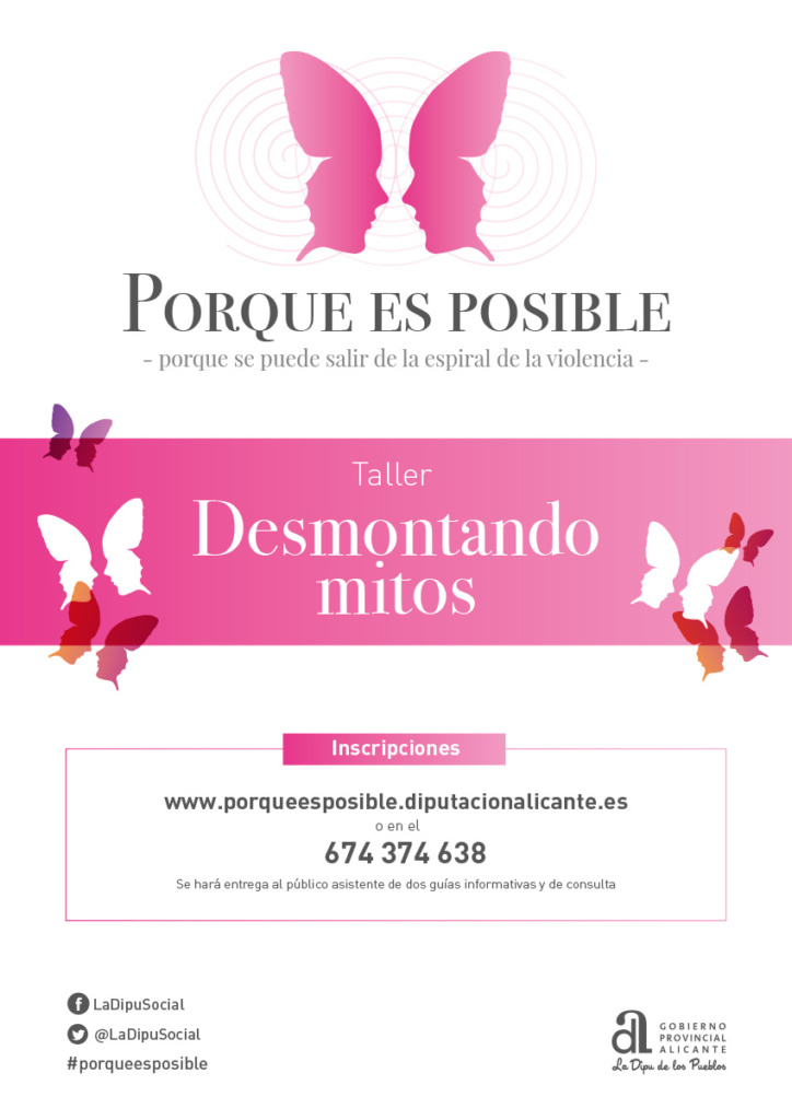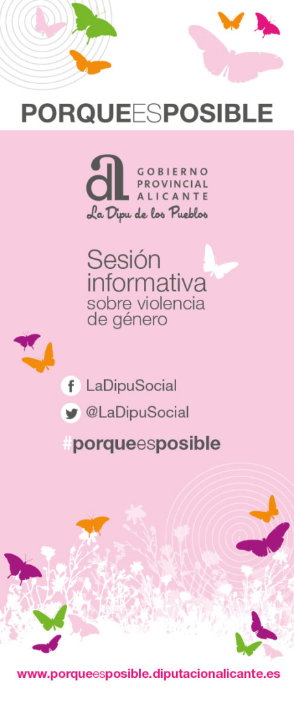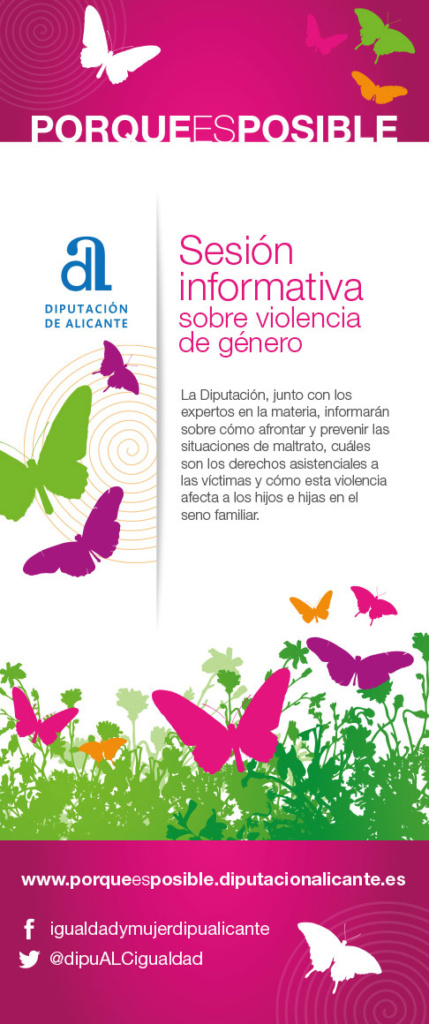 Tareas desarrolladas: Concepto, creatividad y diseño de campaña, programación de una web que facilite la inscripción on line de las personas asistentes, producción de cartelería y adaptación de la imagen a folletos, anuncios en prensa escrita, spot y cuña de radio, gestión de campaña en perfil de Facebook y mantenimiento web, gestión y contacto con los responsables municipales de cada uno de los ayuntamientos, secretaría Técnica y elaboración de un listado de altas y bajas, organización de seis talleres informativos sobre violencia de género, en función de las directrices marcadas por cada uno de los ayuntamientos anfitriones, contratación de un cofee en cada uno de los talleres, grabación y edición de vídeos testimoniales, redacción de textos tanto en castellano como en valenciano, concepto, creatividad, diseño y maquetación de las guías bilingüe, impresión y encuadernación de 500 ejemplares de cada guía.