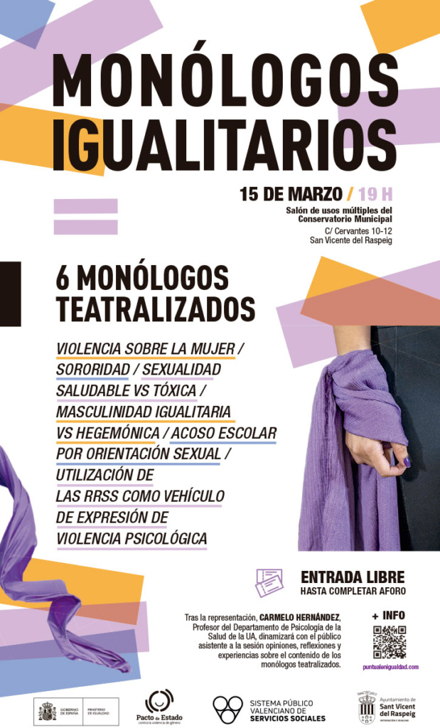 MONÓLOGOS IGUALITARIOS consta de 6 monólogos que profundizan en temas imprescindibles para las nuevas generaciones: violencia sobre la mujer, sororidad, acoso escolar por orientación sexual, sexualidad saludable vs tóxica, masculinidad igualitaria vs hegemónica, utilización de las redes sociales como vehículo de expresión de violencia psicológica…están representados por chicas y chicos jóvenes de teatro amateur que harán al público entender mejor esta problemática que sigue estando presente en la sociedad actual.